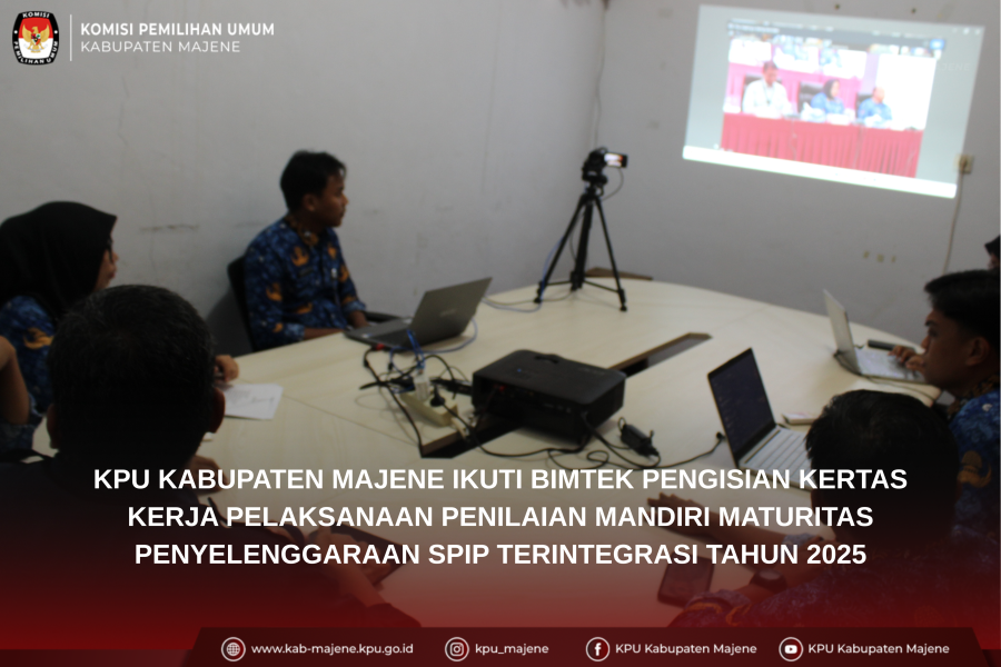 KPU Kabupaten Majene - Ketua Komisi Pemilihan Umum (KPU) Kabupaten Majene, Munawir, bersama Sekretaris KPU Kabupaten Majene, Subhan, Kasubbag Teknis Penyelenggaran Pemilu dan Hukum (TPP dan Hukum), Mashita, serta para staf mengikuti Bimbingan Teknis (BIMTEK) Pengisian Kertas Kerja Pelaksanaan Penilaian Mandiri Maturitas Penyelenggaraan Sistem Pengendalian Intern Pemerintah (SPIP) Terintegrasi Tahun 2025, Kamis (17/07/2025).